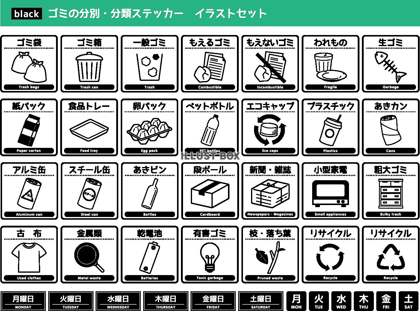 ゴミの分別・分類ステッカーセット 黒:イラスト無料。