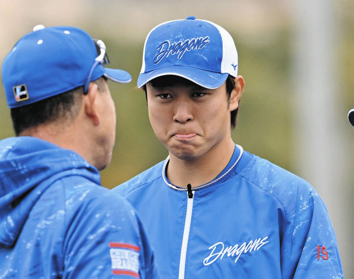 ◇ノック前、不安げな表情で井上監督の話を聞く高橋宏斗 写真 :中日スポーツ・東京中日スポーツ。