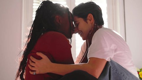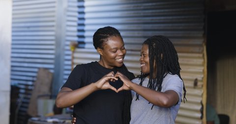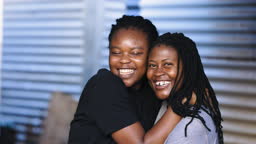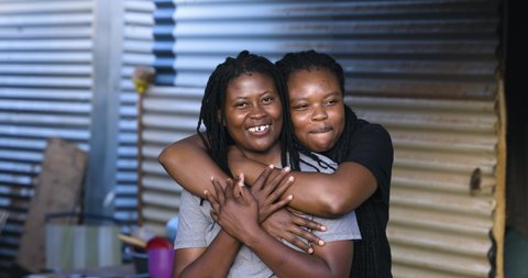 アフリカ系の黒人女性レズビアンの夫婦の接写で、非公式な入植地で愛情を示す南アフリカ」の動画素材 ロイヤリティフリー 1083561610Shutterstock。