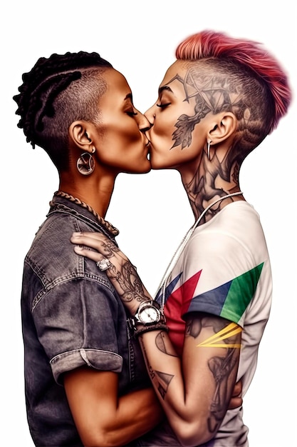 プライド ゲイ中に幸せなレズビアン 1 人の白人 1 人の黒人がキスする生成 AI 背景イラストPremium AI生成画像。