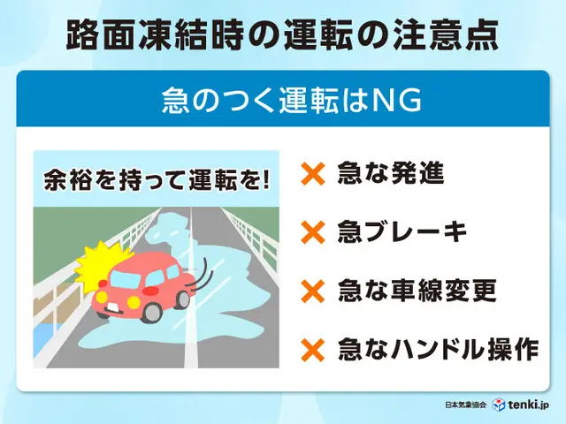 雪道以上に危険!?路面凍結に注意すべき場所や時間帯は?安全に運転・歩行するポイント 季節・暮らしの話題 2024年12月12日- 日本気象協会tenki.jp。