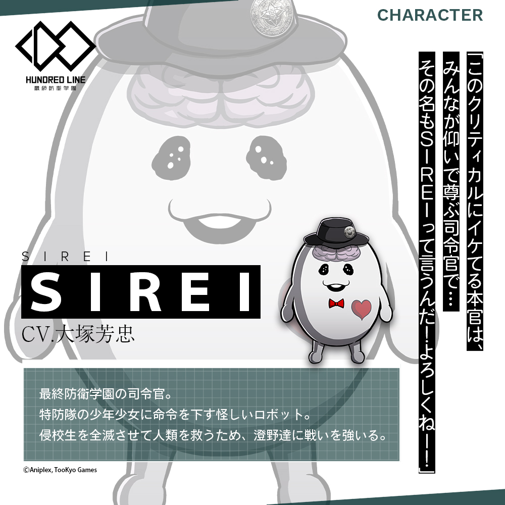 公式 HUNDRED LINE -最終防衛学園- ハンドレッドラインon X: "ハンドラ 情報振り返り🧠SIREI CV. 大塚芳忠さん 最終防衛学園の司令官。 特防隊の少年少女に命令を下す怪しいロボット。 侵校生を全滅させて人類を救うため、澄野達に戦いを強いる。