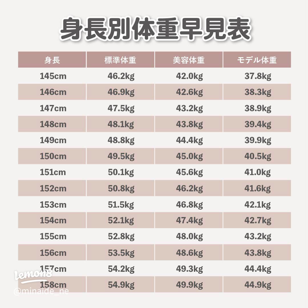 身長別早見表 シンデレラ体重・美容、標準を計算!あなたの理想の見た目は?2025最新版fasme ファスミー。
