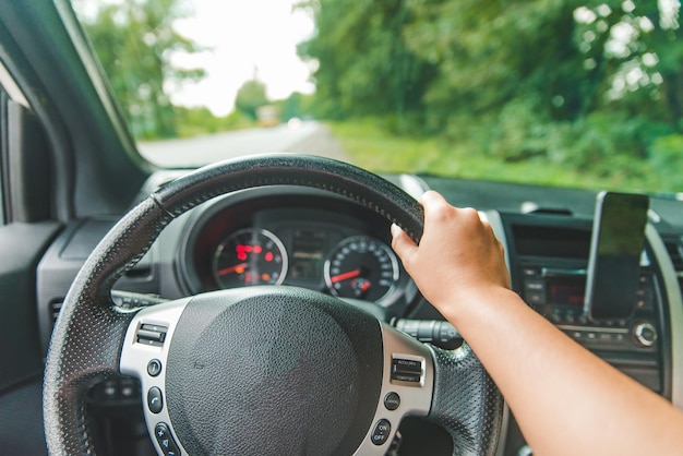 車の運転中にハンドルを握っている男の手のクローズアップ。運転中のビジネスマン、トリミング。スーツのステアリングホイールに運転手の手。男は車に座って ハンドルを握るPremium写真。