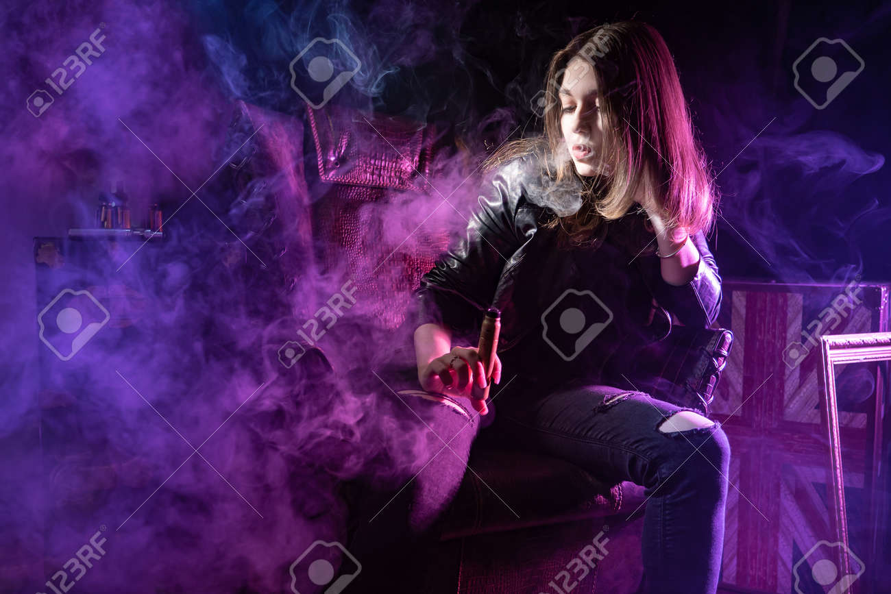 ブロワーが煙を吹きます。ヴェイパーは唇から煙を吹きます。女性は口から煙を出します。コンセプトは喫煙の喜びです。学生が電子タバコを吸います。暗い背景のベイパーの写真素材・画像素材Image 167746530。