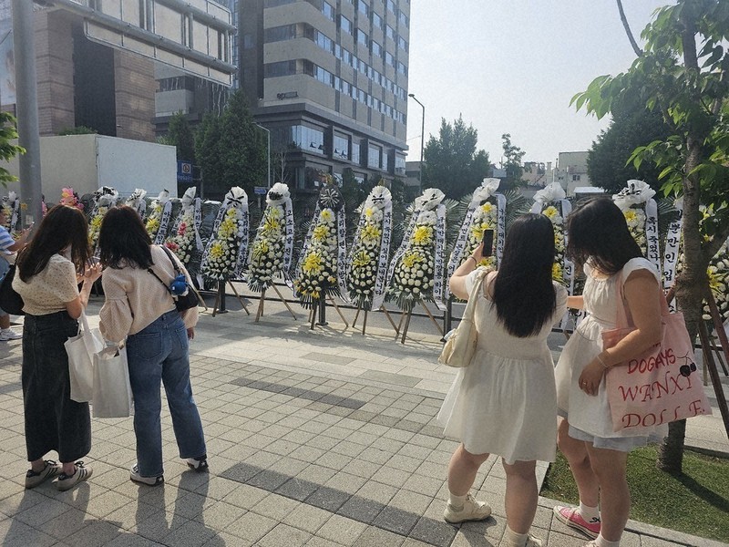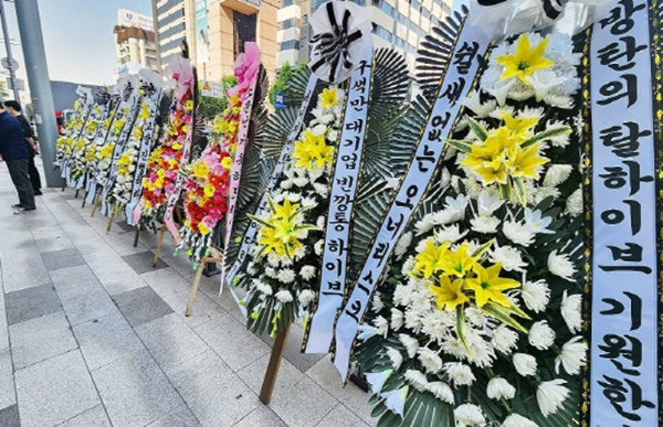HYBE社屋前に「葬儀花輪」 NewJeansファン抗議「倫理観の欠如、冥福を祈ります」 - デバク。