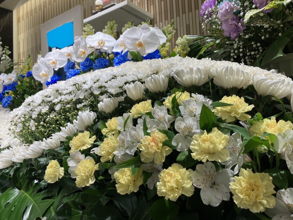 菊のラインと洋花のバランスが美しい生花祭壇です! 菊があると葬儀な感じがしますが、和洋ミックスの祭壇もまだまだ人気です。花flowersfuneralflowerjapan葬儀菊ダリアflowerlovers中野区葬儀社アイユーメモリ。