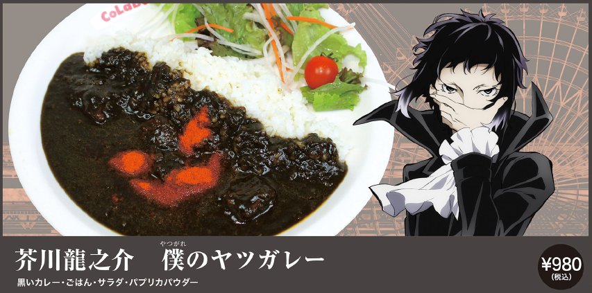 CoLaBoNo コラボノon X: "☆メニュー紹介☆ 芥川さんのメニューは、声に出して読みたい「僕 やつがれ のヤツガレー」です!彼のイメージカラーを使った黒いカレーには羅生門の顔が !サラダも付いてボリューム満点の一皿です♪コラボノは注文用紙に記入するシステム。