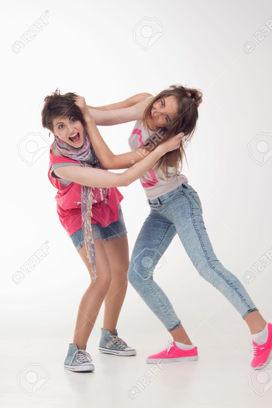 喧嘩、叫んで、白い背景で隔離の自分の髪を引っ張って 10 代の女の子の完全な長さの肖像画。友情の概念の写真素材・画像素材 Image 29349334。