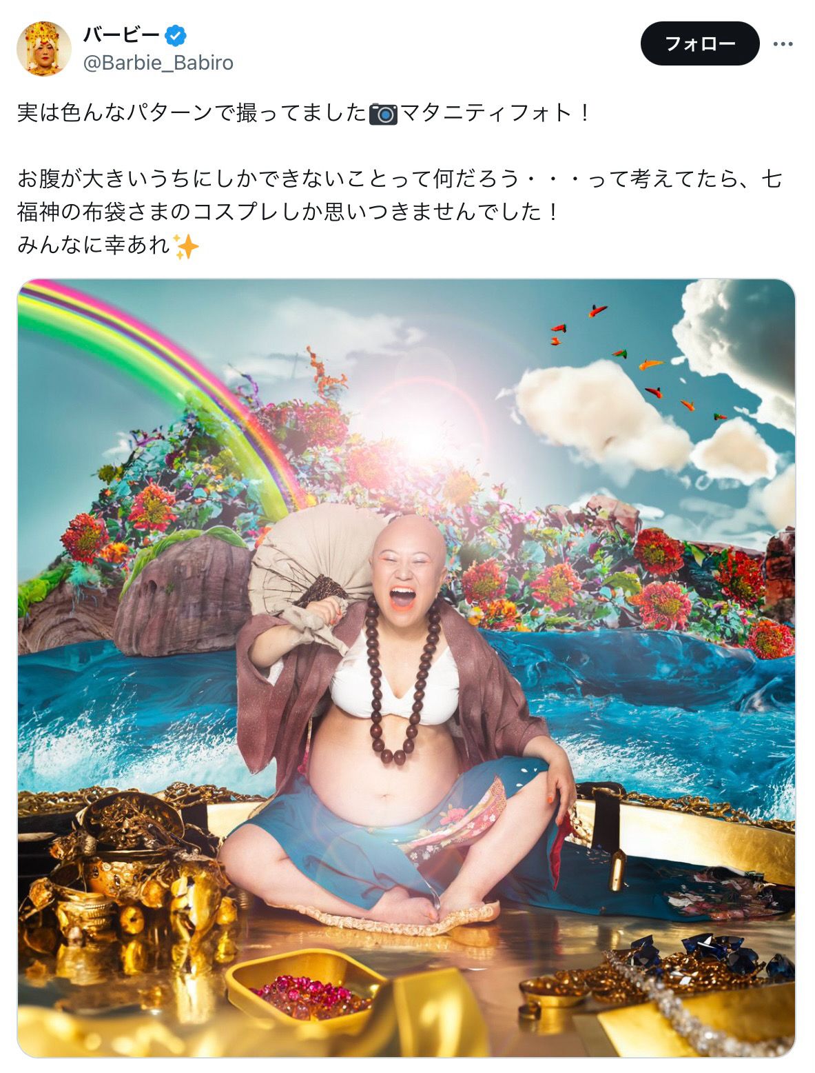 第1子妊娠中のバービー 40七福神・布袋尊姿のマタニティフォトを公開 ファンからは「発想が神」「ご利益ありそう」と絶賛の声めざましmedia“好き”でつながる。
