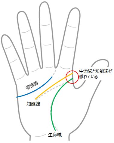 離れ型生命線と知能線の起点 始まり が離れている相手相観ぱなせ。
