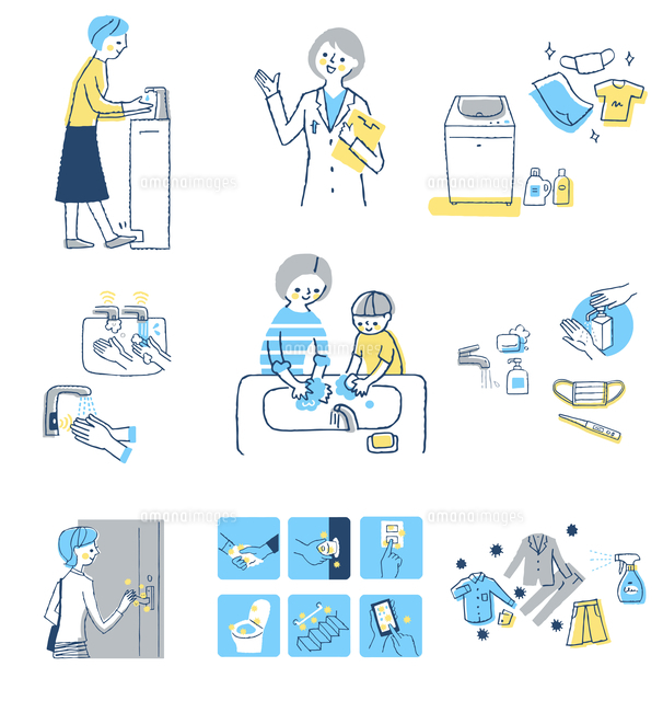 感染症対策イラスト 手洗い・アルコール消毒・体温計・マスク・換気・うがい 新型コロナウィルス Stock VectorAdobe Stock。