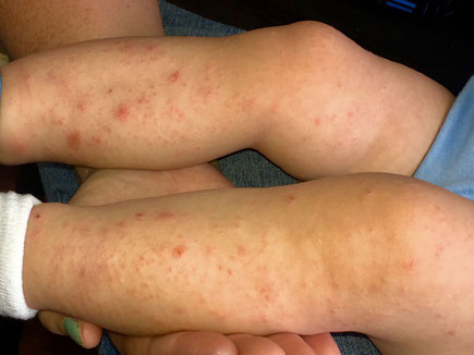 円型状の発疹が多発している湿疹野田市 小児科 千葉県 こどもの花粉症 こどもの漢方 喘息 アトピー性皮膚炎 アレルギー 結節性痒疹たんぽぽこどもクリニック。