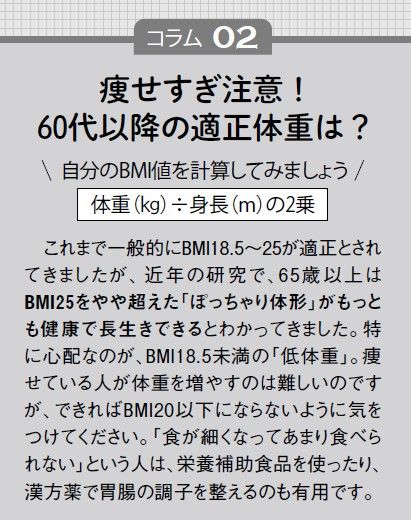 4ページ目 女性ホルモンが減ってきたら「ややぽっちゃり」を目指しましょう。痩せ気味女性は、体重をちょっと増やすだけで「疲れやすい」「冷え」の解消にも専門医によるアフター更年期13の悩み別アドバイス<1>健康婦人公論.jp。