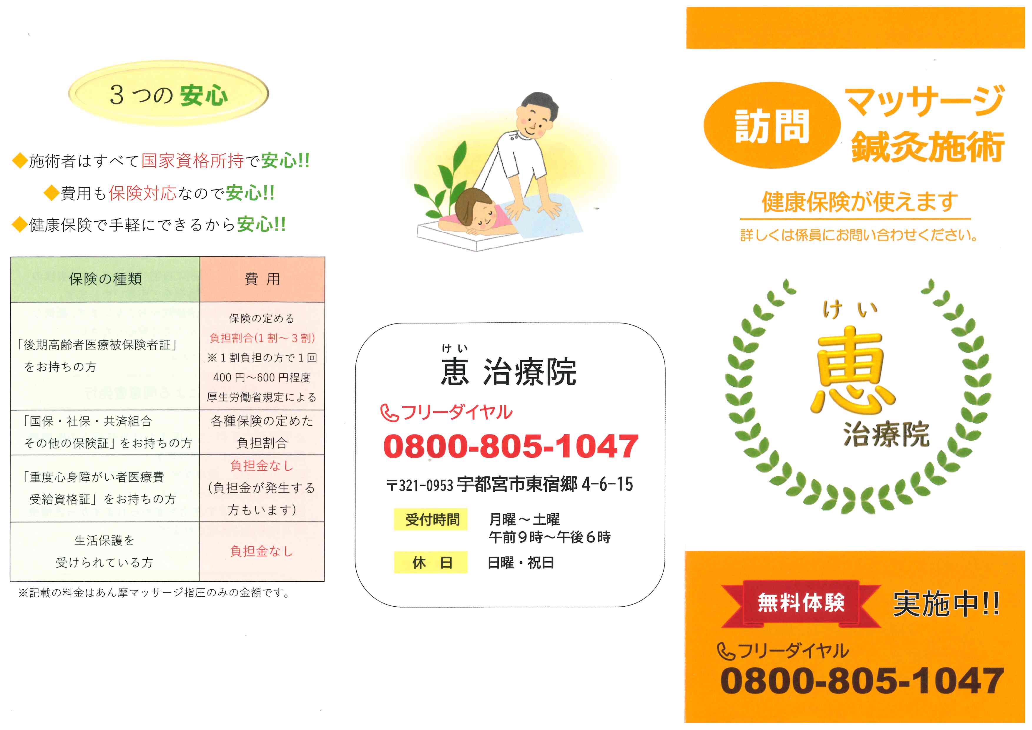 訪問マッサージ・鍼灸施術の恵-けい-治療院さまのチラシをご紹介いたします!宇都宮の販促はアドポスへ。