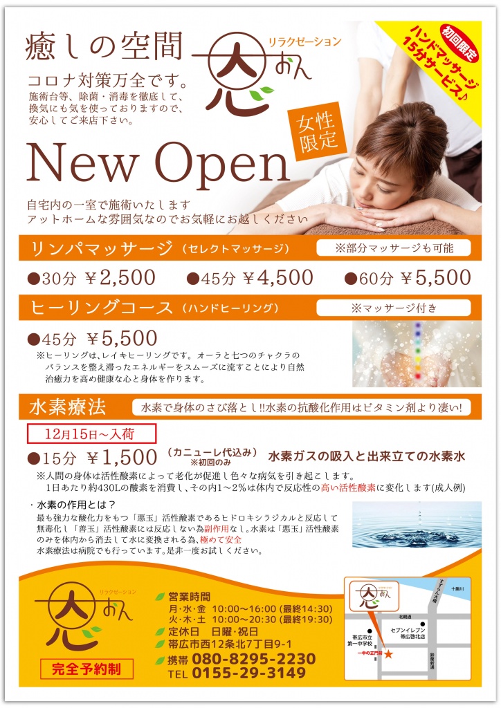 オープンは10月2日㈮チラシ - 府中のマッサージ店をお探しならリラクゼーションcalme。