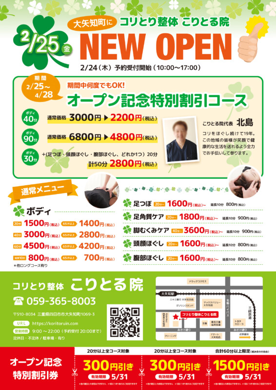マッサージ・整体_開業・オープン_ナチュラルチラシ・フライヤーの無料デザインテンプレート - ネット印刷グラフィック。