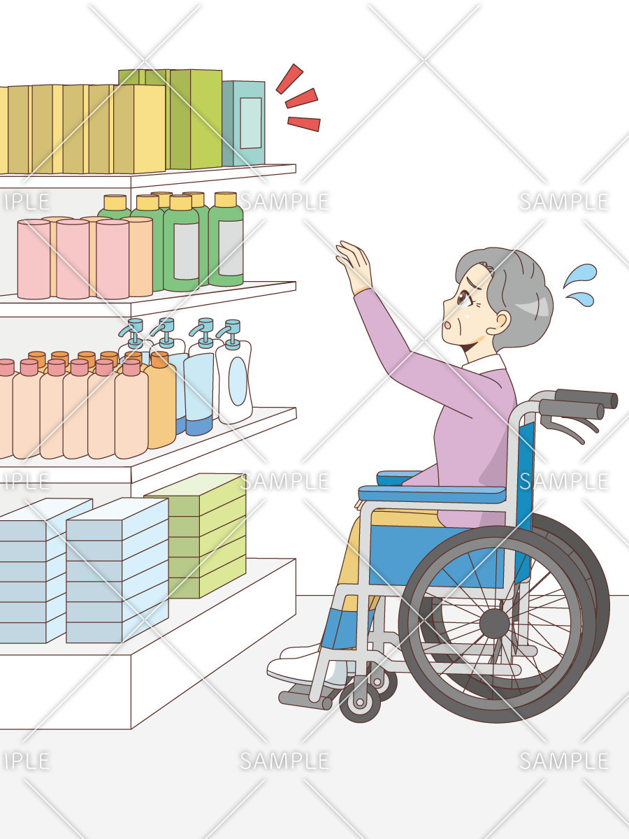 品物に手が届かず困っている車椅子の女性高齢者 バリアフリー 福祉用具 の無料イラスト介護アンテナ。