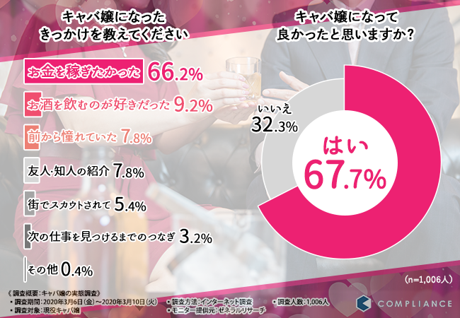 キャバ嬢の実態調査 キャバ嬢になったきっかけから、優良客・ムリ客の特徴まで お酒の席で参考にしたい回答も!株式会社コンプライアンスのプレスリリース。