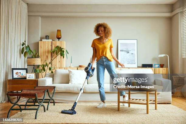 仕事とハウスキーピング中に音楽用の掃除機とヘッドフォンを使用して黒人女性クリーナーを掃除する家事家政婦と一緒にポッドキャストラジオまたはオーディオを掃除し、衛生のためにリビングルームでサービスを掃除するPremium写真。