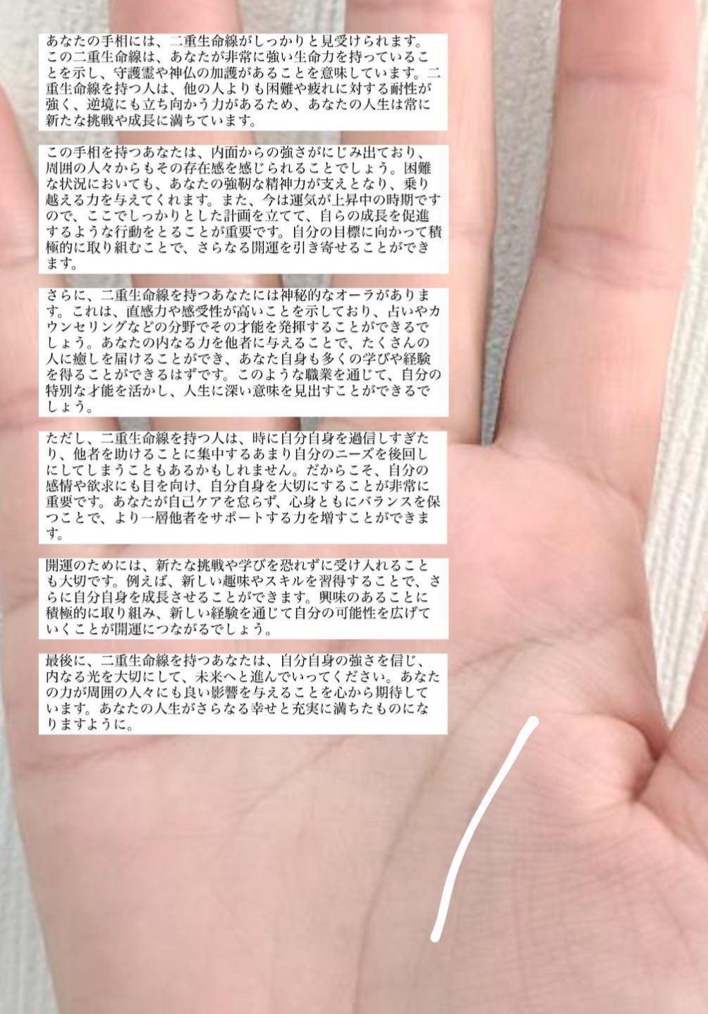 今回は生命線の内側にある二重生命線, について解説します🙌, もちろん、二重生命線なので, 健康寿命が長かったり、回復力も強いですが、,内側の線が薄い場合は、表面的にわかりづらく, ある事をきっかけに体力が増える意味も, 含まれています!その場合は筋トレや運動をすると◎,他にも行動力と柔軟性を持ち合わせた, とても素晴らしい手相となっていますので、, 自分をとことん褒めたり、周りの意見に,。