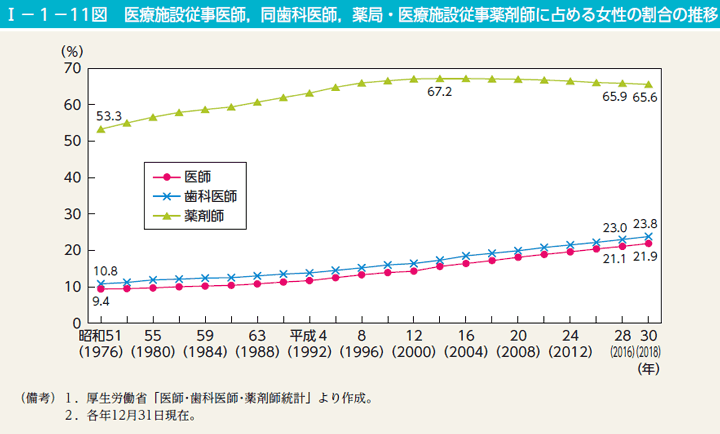 I-1-11図 医療施設従事医師,同歯科医師,薬局・医療施設従事薬剤師に占める女性の割合の推移内閣府男女共同参画局。