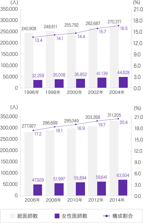 日本の女性医師の割合は? PickUp 医療データ110– 日本医事新報社。