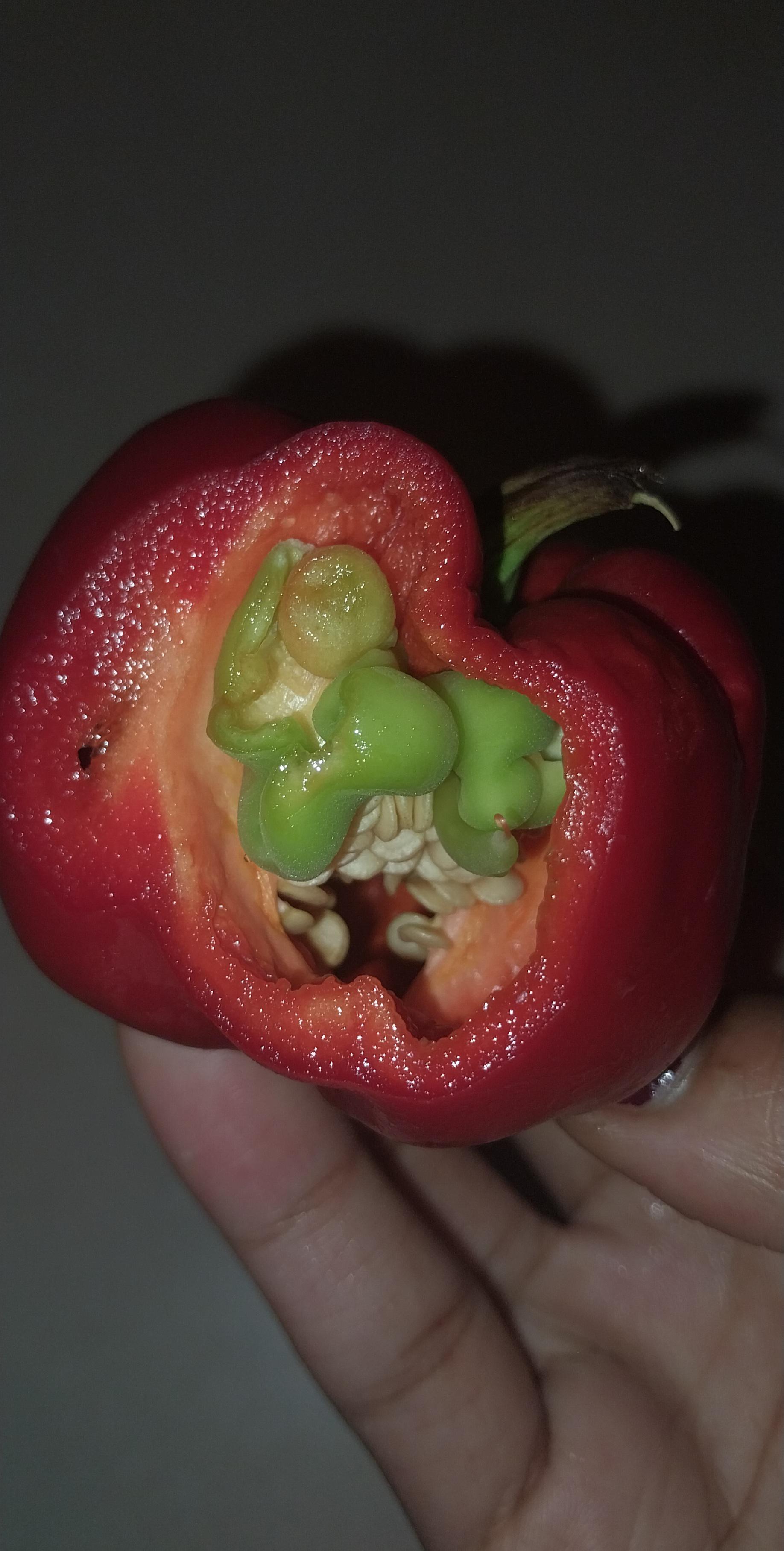 赤ピーマンの中に小さな緑の赤ちゃんピーマンが入っていた。 – KEISUI ART STUDIO。