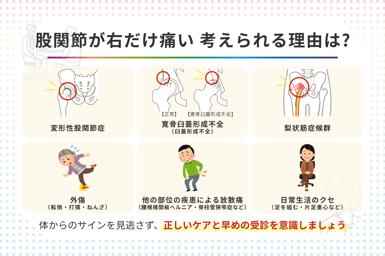 股関節が右だけ痛い 左だけ 原因・対処法を理学療法士が解説!青山筋膜整体理学ボディ。