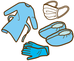 嘔吐物処理ー手袋とマスクを装着した人のイラストイラストほけんしつ。