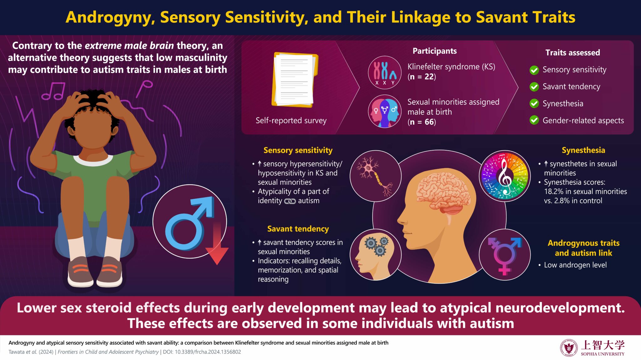 自閉スペクトラム症の特性と発達初期における男性ホルモン低下に関連の可能性上智大学。