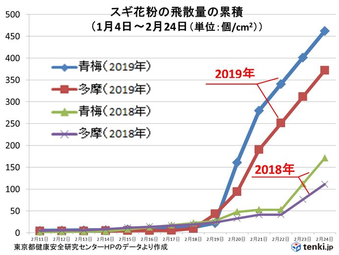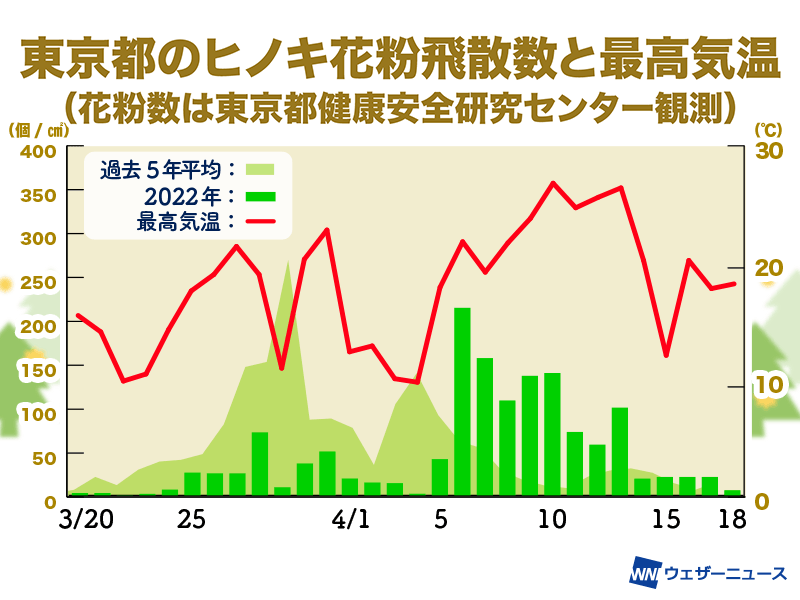2024年春の花粉飛散予測更新 まもなく飛散終了へ 東京の総飛散量は例年並み 気象予報士 石榑 亜紀子 2024年04月18日- 日本気象協会tenki.jp。