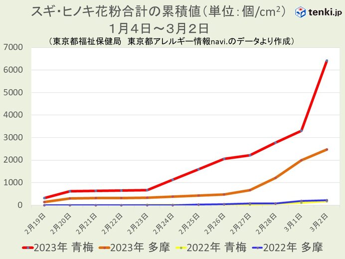 3月はスギ花粉ピーク 大量飛散続く 東京都内の花粉飛散数まだ予測最大値の約2割 気象予報士 吉田 友海 2023年03月04日- 日本気象協会tenki.jp。