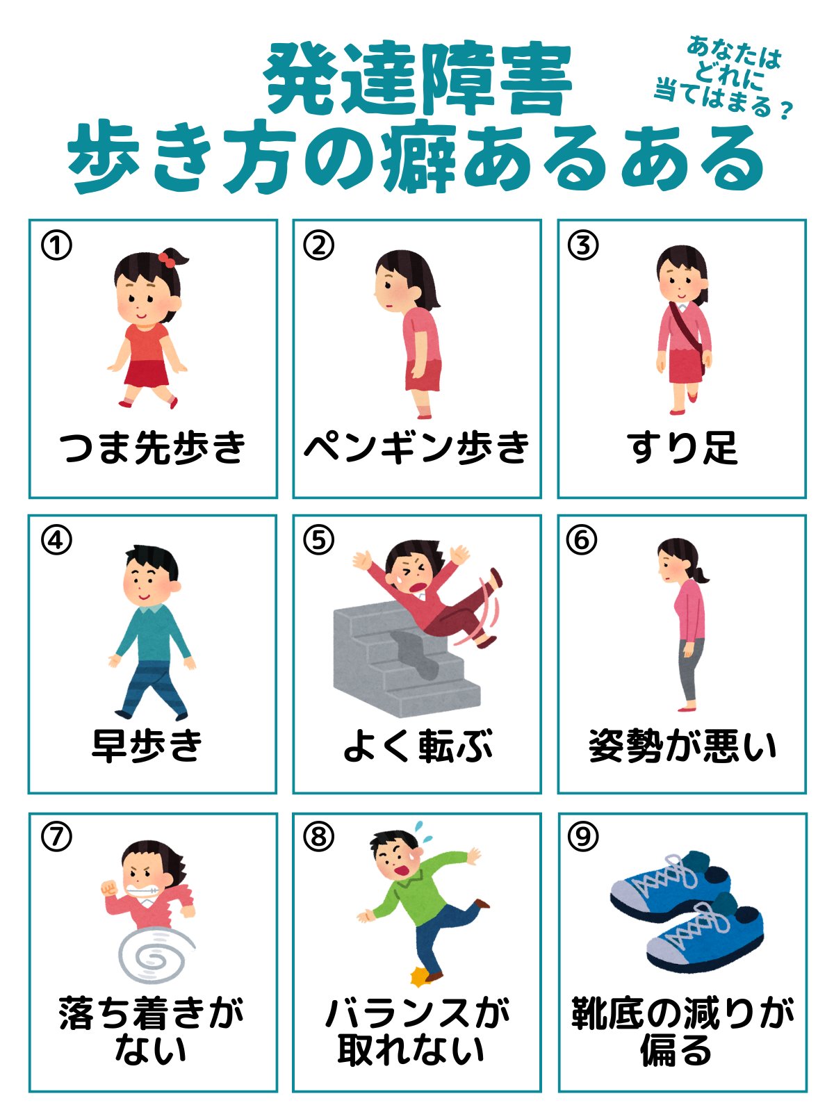発達障害カウンセラーかずき@ADHD ASD on X: "本日は、発達障害 歩き方の癖あるあるをご紹介します!みなさんは当てはまる項目ありましたか? 丸をつけてみてくださいね✨発達障害発達障害あるある歩き方癖https:t.co b61oJeyYOj"X。