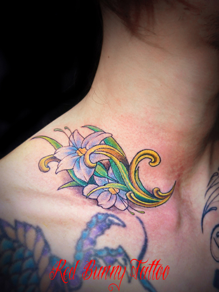 ワンポイントタトゥー 女性の和彫り 百合 鎖骨 花 〜ryujitattoo〜Ryuji tattoo studio。