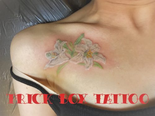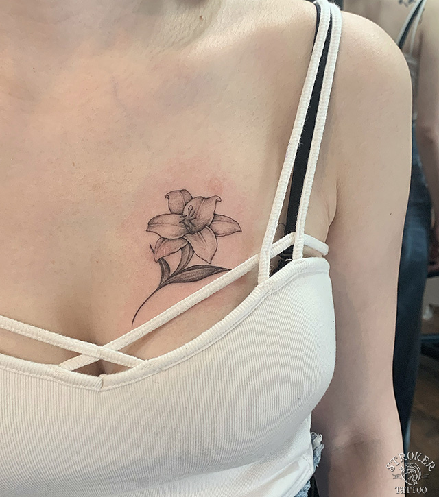 胸にユリの花静岡でタトゥーをするなら洋彫り・和彫りも得意なTrick Boxへ。