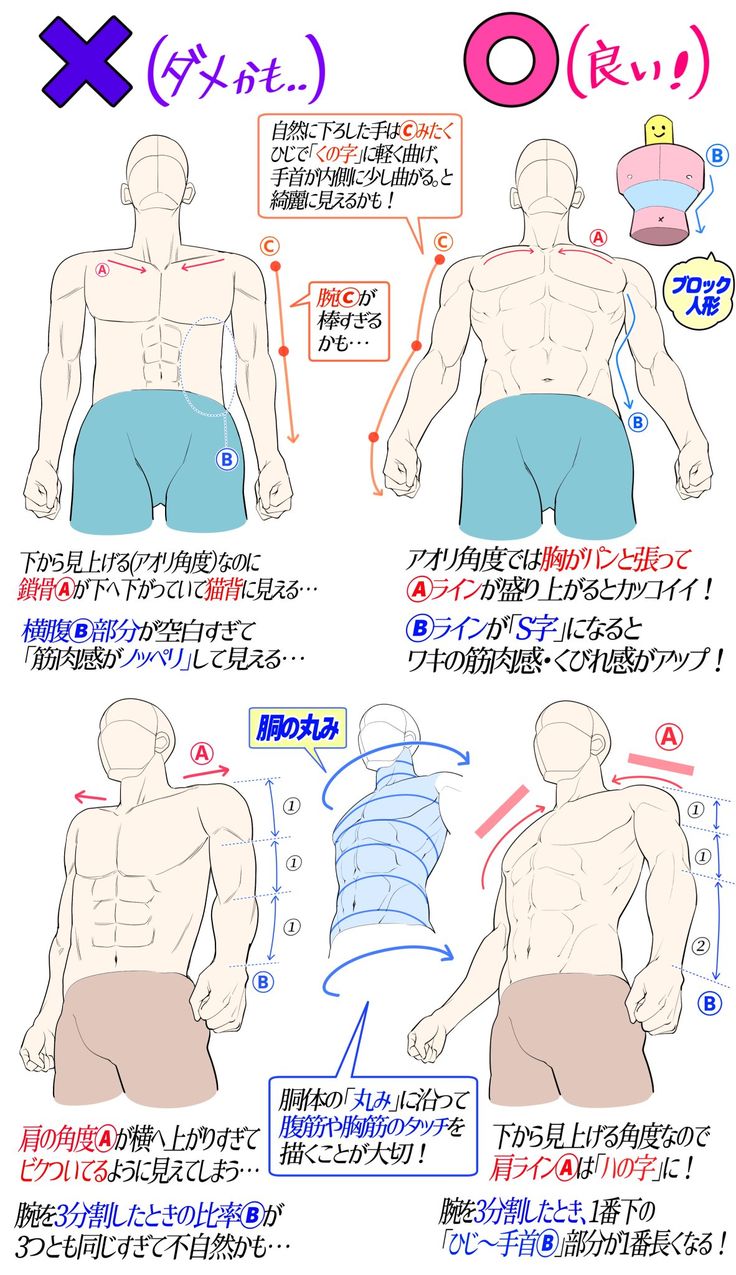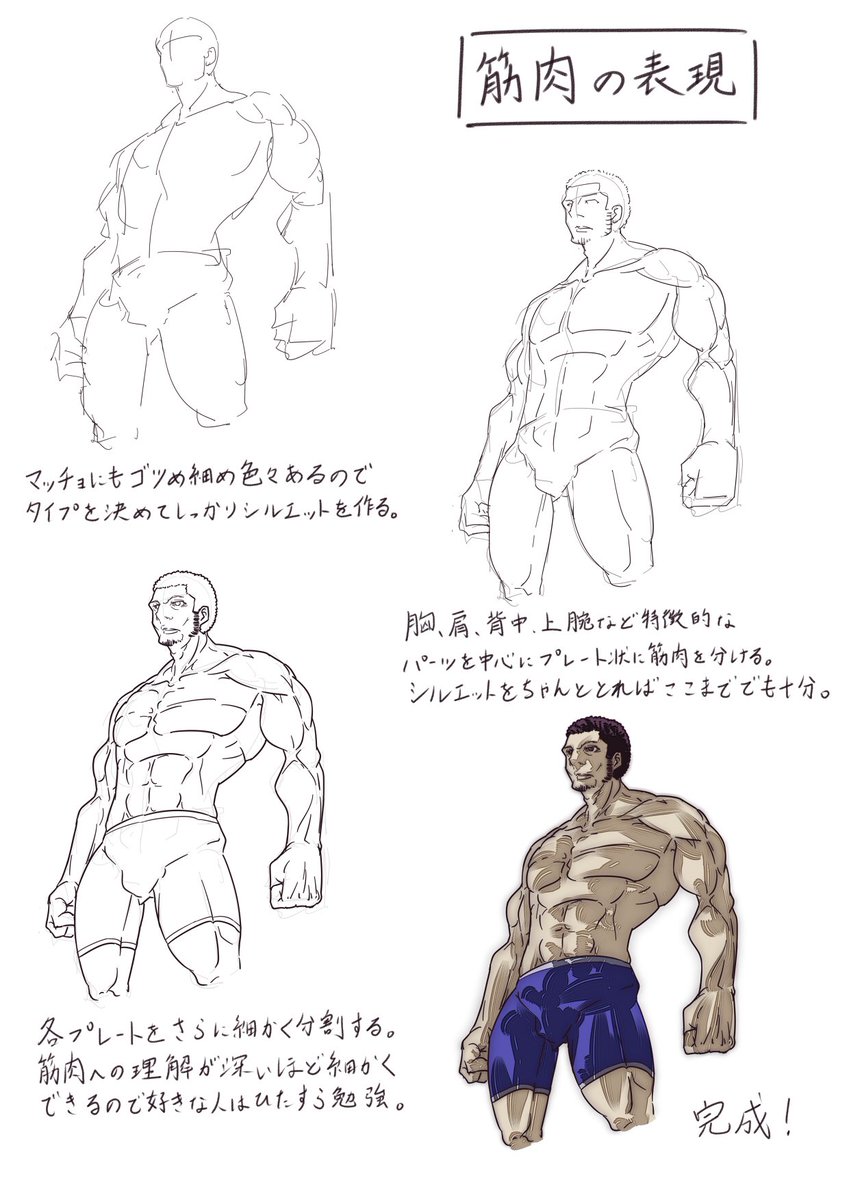 プロ監修!!イラスト講座 on X: " 筋肉の描き方細マッチョ、ゴツめのマッチョでシルエットも異なるので最初にタイプを決めたうえで描いていきましょう。https:t.co Md1nOivrNX"X。