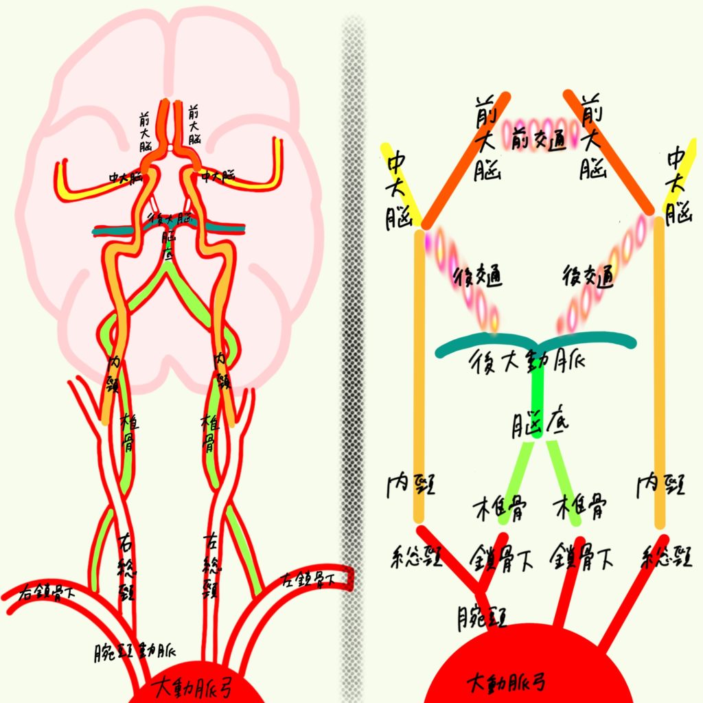 ウィリス動脈輪訂正⭐️ 鎖骨下動脈と腕頭動脈の位置は本来であれば 右から腕頭→総頸動脈→鎖骨下動脈の順です🫡 略式したためにわかりづらくなってしまいすみませんでした。 右の図はウィリス動脈輪をわかりやすくするために書いたもので本来の血管たちの位置は左側で。