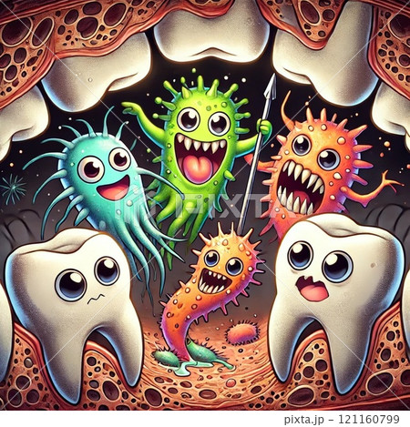 口の中に虫歯の原因となるバイ菌のイラストのイラスト素材121160804- PIXTA。