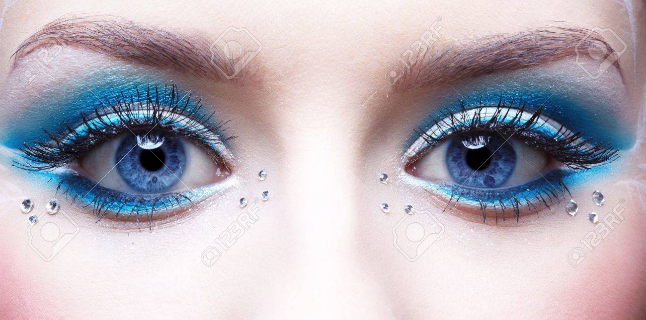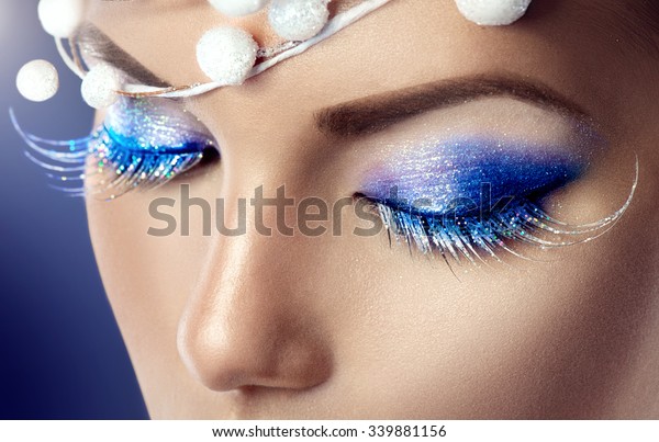 きらめく青い目とつけまつげで、冬のクリスマスの目をあしらう。パーティーアートモデル女性のメイク。クリエイティブガールホリデーメイク。青の背景に雪のクイーンハイファッションのポートレート写真素材339881156Shutterstock。