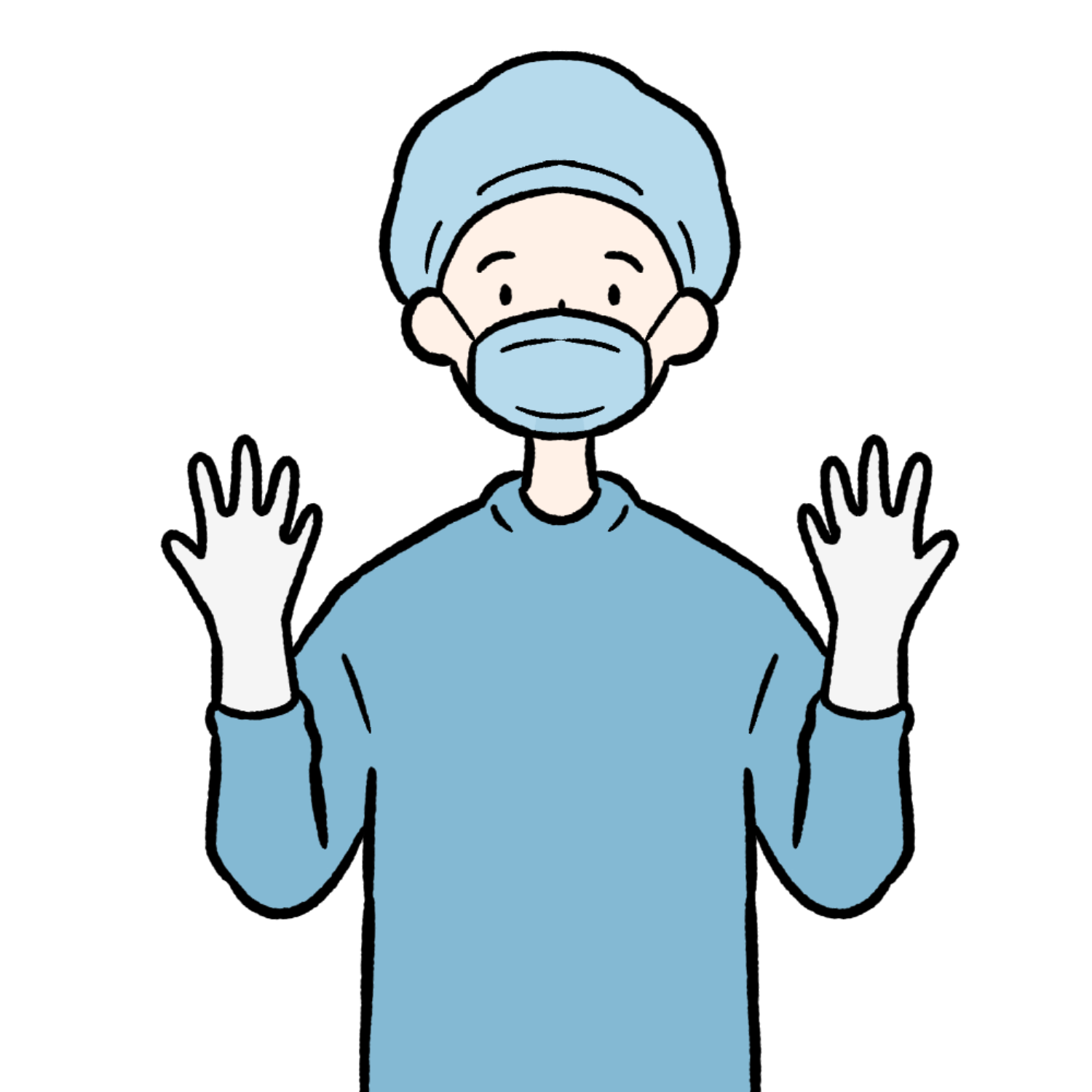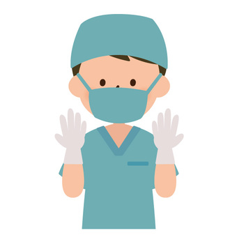無料素材青い手術着を着て白い手袋をはめた外科医を描いたイラスト。