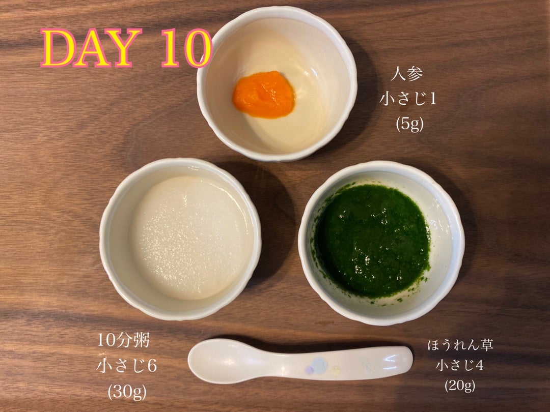 0y5m15d 離乳食初期① 8日目~10分粥・ほうれん草ペースト~見習い管理栄養士のできごと レシピブログ。