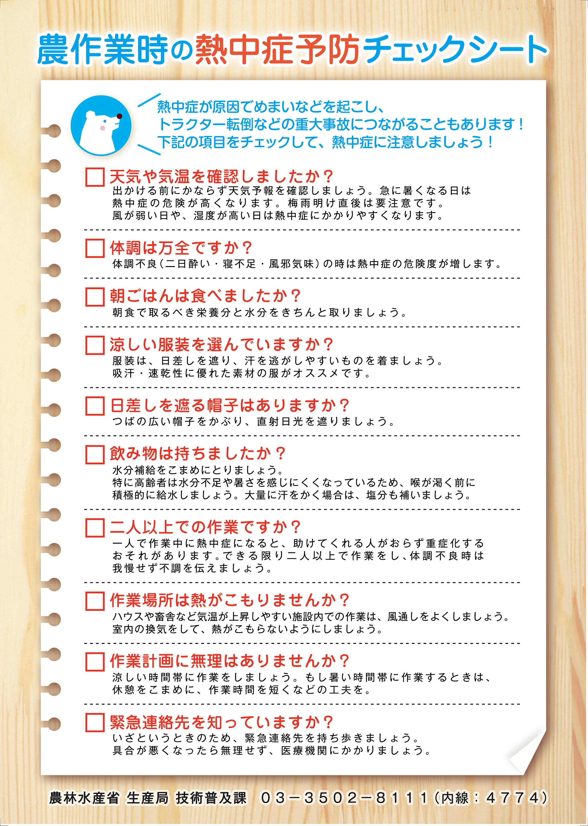 農作業中の熱中症にご注意!熱中症予防のための注意喚起チラシを作成しました。お知らせ一覧JA全農宮城。