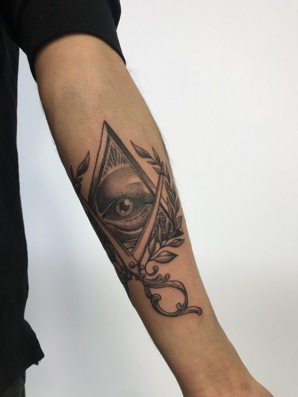 プロビデンスの目、ハサミ、タトゥーRYU'S DESIGN Custom Tattoo。
