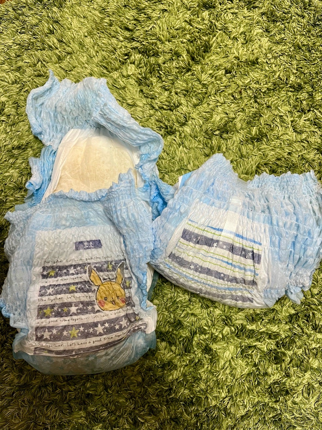 小学生の女の子が学校ではいたおむつとおねしょしてぱんぱんのオヤスミマンなのはのおむつ。