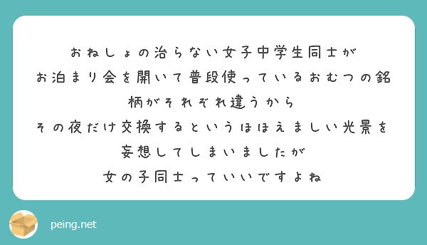 おねしょの治らない女子中学生同士が お泊まり会を開いて普段使っているおむつの銘柄がそれぞれ違うからPeing -質問箱。