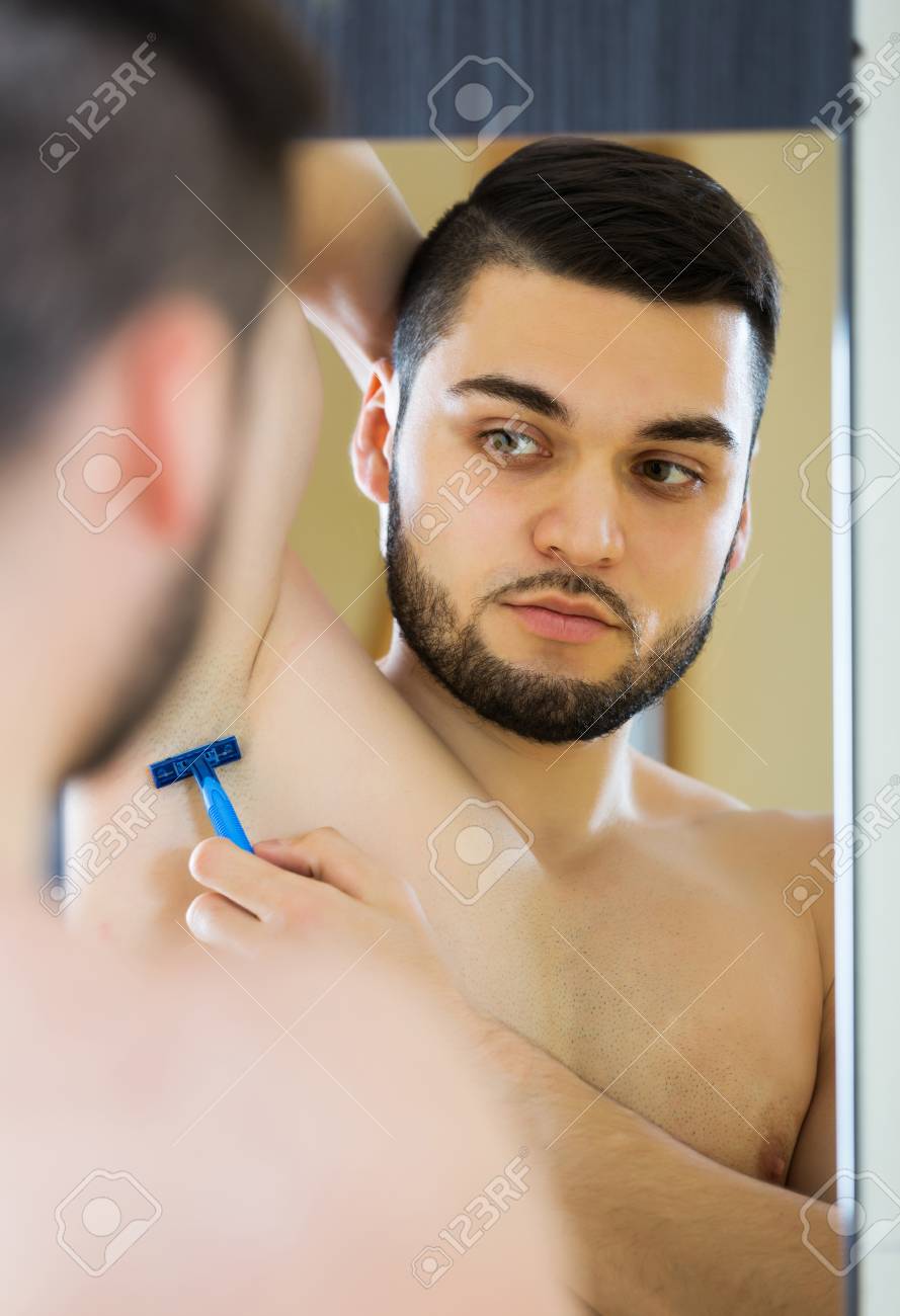 鏡を見て、剃刀で脇毛を剃る男の写真素材・画像素材 Image 40442055。