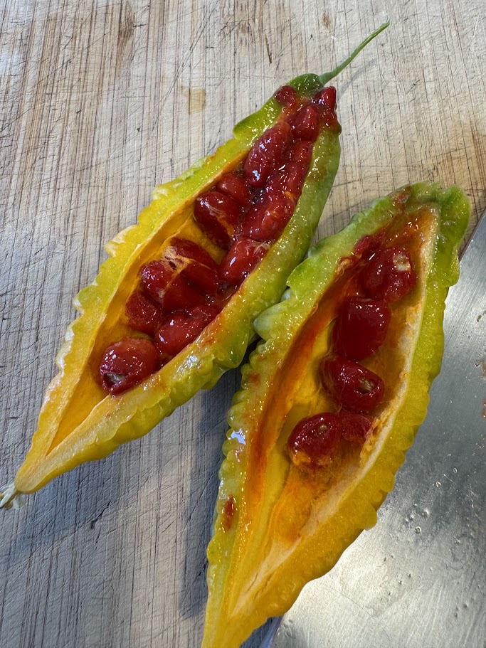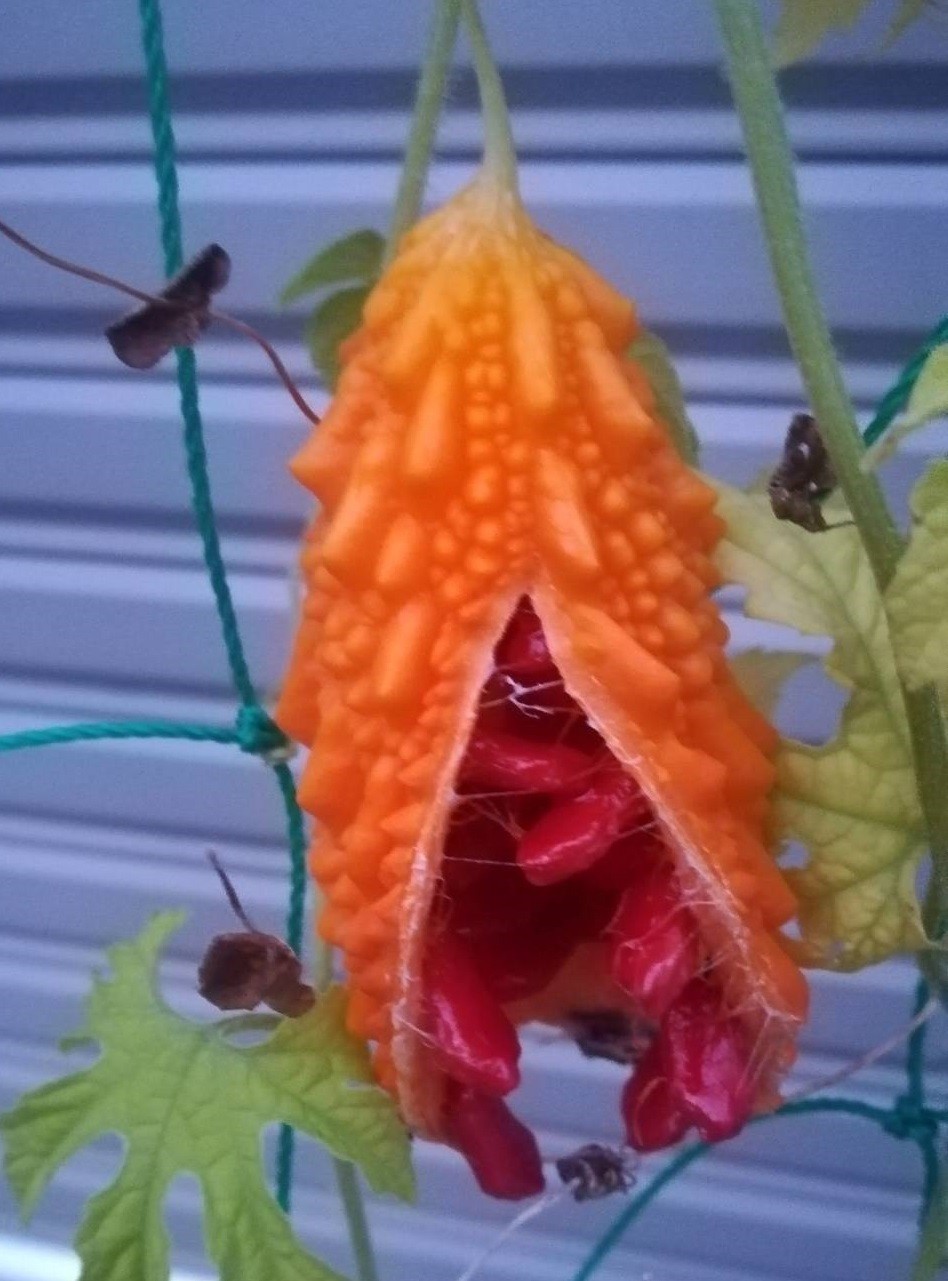 完熟したゴーヤ。種の周りは赤いゼリー状になっています。ゴーヤは苦いですが、完熟したオレンジのゴーヤは甘くなります。これはゴーヤの戦略です 。外側がオレンジになりタネの周りが赤くなることで鳥に見つけやすく、また食べてもらうためです。鳥は遠くへ運んでフン。