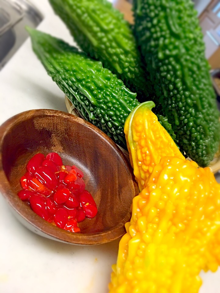 ゴーヤの熟した赤いタネ , もう、ゴーヤも終わりですねー!, 今年はゴーヤチャンプルーよく使ったなぁー。,今年の夏、なかなか出会えなかった熟したゴーヤちゃんにやっと出会えました!, タネがプルプルで真っ赤!,この真っ赤なゴーヤのタネって食べられるの知ってました?, 正確にはタネの周りを食べるんですけど。, とってもフルーティで甘いんです。,なおちゃんと一緒にパクリ😊,。