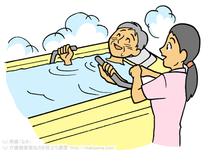 機械浴・特別浴で高齢者・要介護者の入浴介助のイラスト介護看護リハビリのフリー素材集。